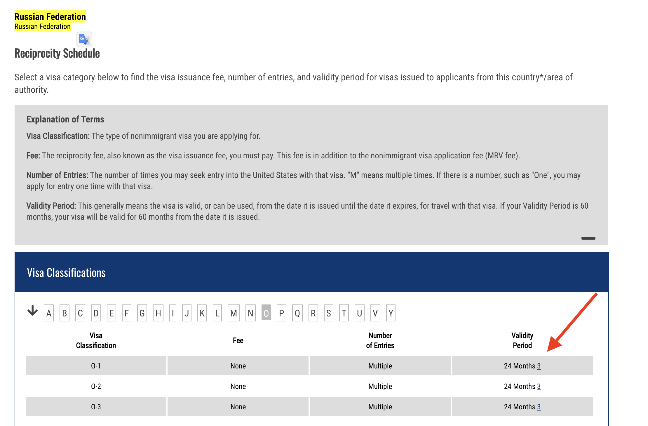 La Tabella di reciprocità per la RF: O-1 - 24 mesi, ingressi multipli. Fonte: travel.state.gov